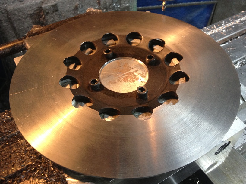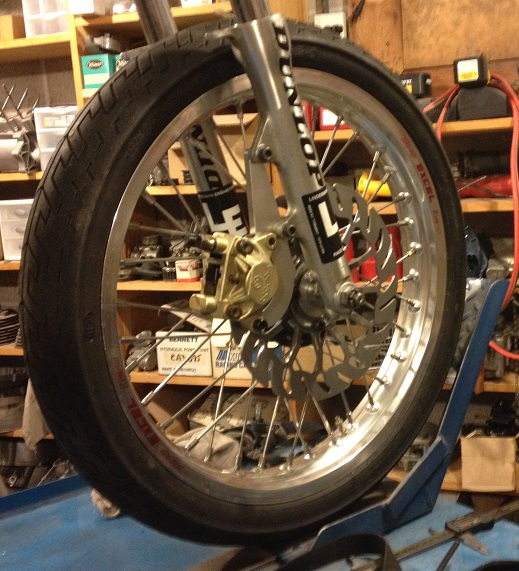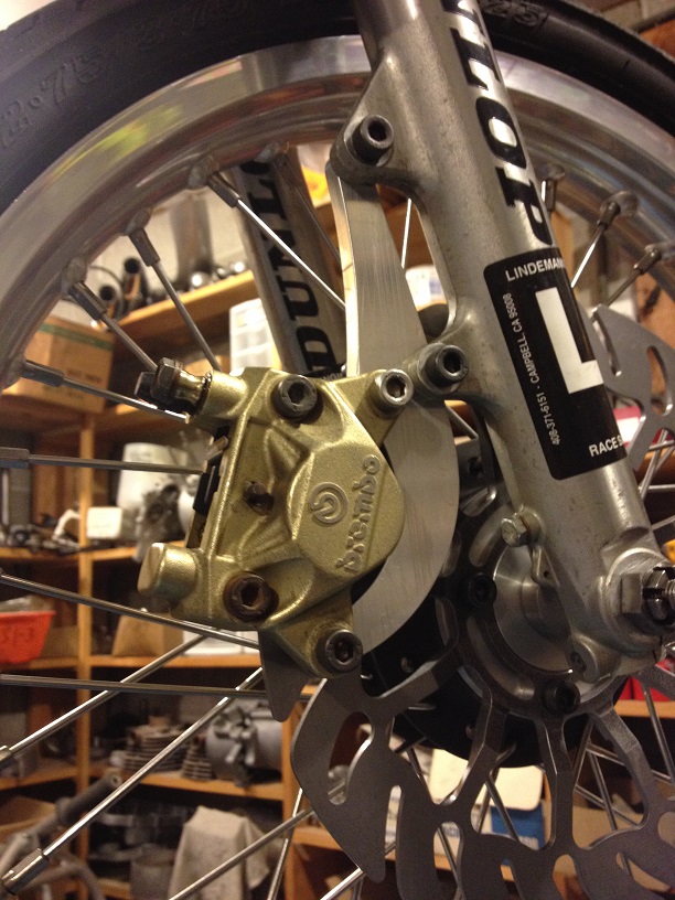| Mounted on the RS125 fork with a rear caliper from a Ducati Monster. | |