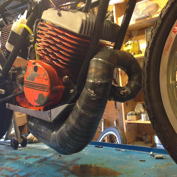 This is the new pipe. The first one didn't make much power and the second one made 46HP even though I had to shorten it so it would fit. This one is over 5 feet long so I had to curl it up at the front to get the fat section under the motor. I haven't tried it on the dyno yet. |