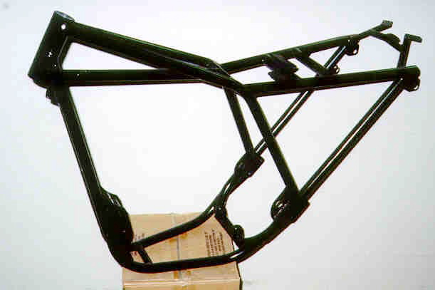 This is the Kawasaki Bighorn that we made when the AMA allowed 350 singles into the 250 class. Kevin designed it and I used 1-1/8 16 ga. tubing for the front section and 3/4 for the rear. We reworked an A1R transmission for it. The swingarm was welded up out of 16 ga. sheet metal. |