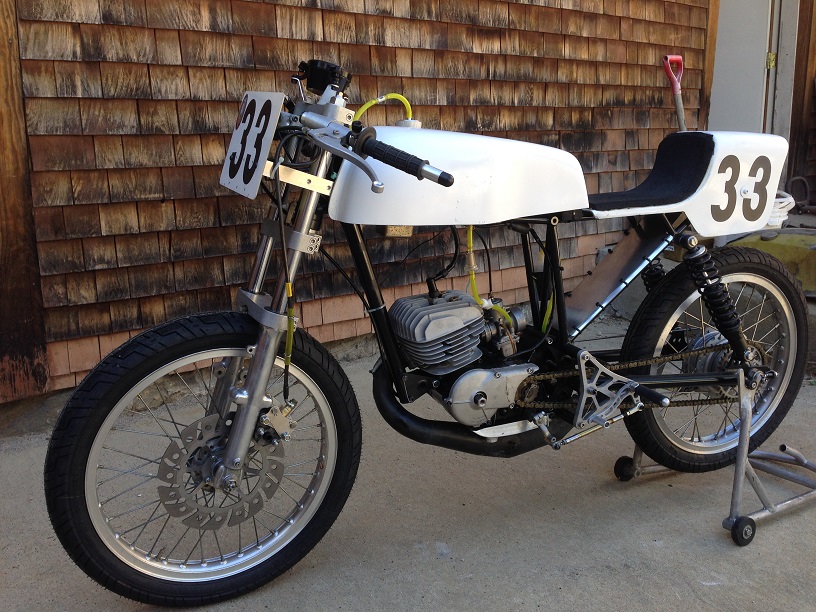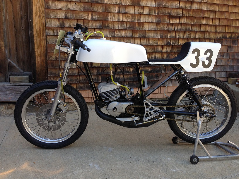 | The new frame is much more comfortable to ride. The original frame was made to fit a skinny 10 year old. | We rode it at the new track in Canaan NH and it handles great. Now we have to make it as fast as my RD200. |